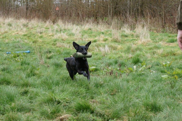 The inexperienced dogs started with a short two dog walk up with a single mark for each. The second test was a mark into the wood. Test 3 involved the dog sitting whilst three tennis balls were tossed, landing close by and then there was a short mark. Their final test was a longer mark landing in the clover in front of a hedge.