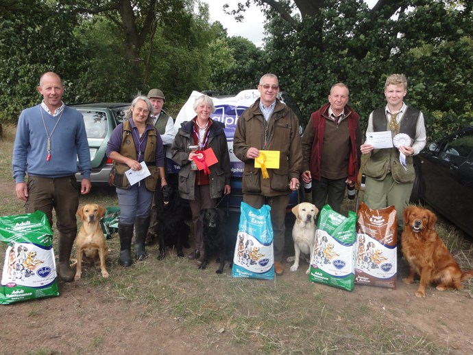 The Open Cold Game Test at Edwinstowe, Nottinghamshire was held on 9th September 2018 by kind permission of Mr Robert Bealby and generously sponsored by Alpha Feeds. The judges were John Day and Alan Richardson. With Malcolm Peacock as Chief Steward directing operations. The card of 30 included three breeds of retriever. The weather was sunny and dry with a stiff breeze. The ground consisted of 30 acres of sugar beet, bordered by a field of Maize to the West and part of Sherwood Forest to the North. In the morning the beet was walked up in line gently uphill following the rows. Each judge had two dogs in line at a time, with retrieves saluted by guns on either flank. Forward marks either side or behind the line required dogs and handlers to concentrate on marking, with two or even three birds out at once or in quick succession. In the second round dogs were sent for cross retrieves or for blinds behind. After three retrieves in the morning walk-up, 12 dogs were called in after lunch. This time the dogs were tested on a long blind through the beet towards rough grass bordering a ride along the forest margin. This retrieve was into a stiff breeze and only five of the twelve retrieved successfully. After the concluding refreshments the trophies, five awards and prizes of Alpha dog food were presented by Area President Elaine Welburn.