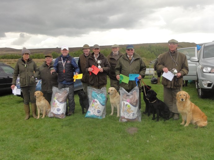 The Open Working Test was held on Sunday 5th May 2019 at Hoyles Farm, Strines, South Yorkshire by kind permission of Mr & Mrs Hunt and Mr Burley. 29 dogs were entered, 25 Labradors and 4 Golden Retrievers. Prizes were generously sponsored by Alpha – the food of Champions.The weather was cool and cloudy with a light breeze. The three judges were Steve Crookes, Anne Crookes and David Haycock. Rolling land with views over gritstone cliffs towards reservoirs in the valleys was a scenic setting. In the morning David judged a blind on the rocky gritstone escarpment, followed by a remembered mark over the top on the plateau with the fall out of sight of handlers. Meanwhile Anne judged a pick-up of two blinds where scrubby woodland had invaded rushy moorland. Steve’s test was a mark diagonally across a long narrow pond. After lunch there were two further tests. Dave judged a double mark at a good distance across moorland. Meanwhile Anne and Steve judged a walk-up with four dogs in line. Retrieves alternated with a mark falling over a heathery knoll for the left hand judge’s dogs followed by a blind across the pond for the right hand judge’s dogs in turn. A number of failures and subsequent eyewipes greatly influenced results. The awards were shared by local members and some from other regions.