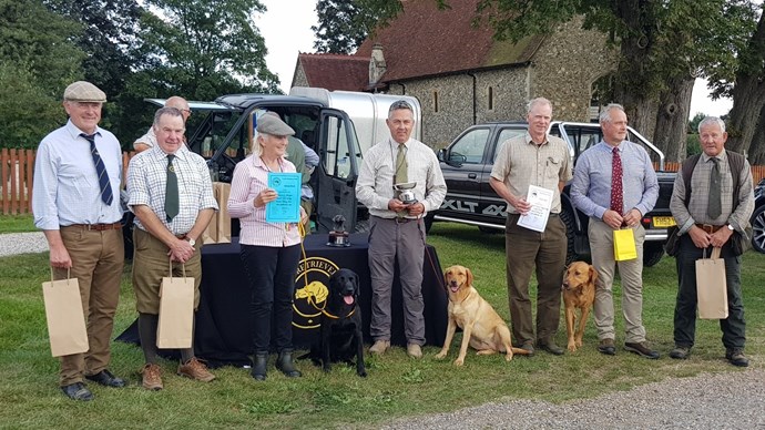 The first two rounds followed a busy partridge drive over long grass and hedgerow cover. Weather conditions were not ideal: early morning cloud cover soon evaporated away to leave a very warm day with the lightest of winds. Therefore, both dogs and handlers were well tested in their abilities to hold an area and hunt game in low scent conditions. A further drive took place for the third and final rounds, with four dogs progressing through. Again, testing conditions meant that the best dogs remained at the end of the trial and were placed in the awards: