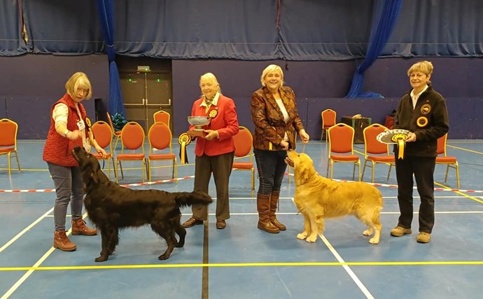 Best in Show was the Flatcoat CALZEAT GENTLEMAN'S AGREEMENT TO HEATHERIDGE JW and Reserve Best in Show was the Golden QUAKERHALL SEA MASTER BY BLUEWATERS JW