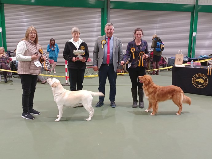 Best in Show Neachells’s Labrador Suttonpark Consuela and Reserve Best in Show Elkin’s NSDTR Tollekin Caife Americano SGWC